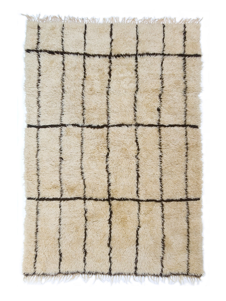 This all natural, undyed wool Beni Ouarain pile rug (tahlast) is a lovely and simple rug from the masters of Moroccan weaving. Size is smaller than the usual white giant sleeping rug size and perfect for more modest rooms.